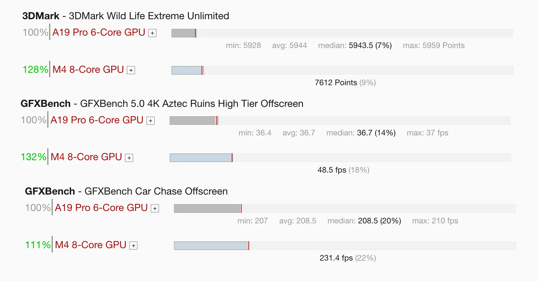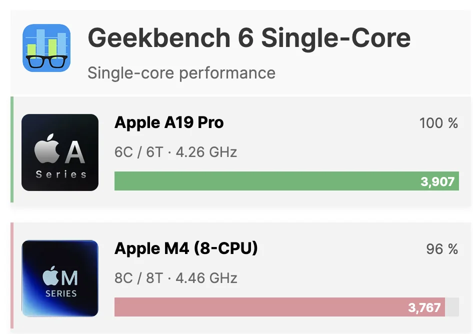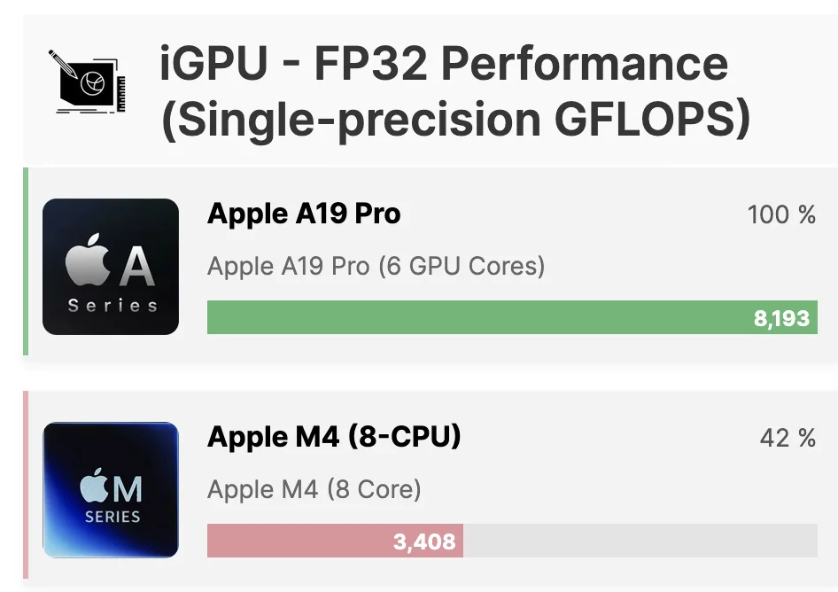 The benchmarks indicated that the new A19 Pro, despite being a chip designed for smartphones and having fewer GPU cores than its laptop siblings, is competitively performant even for gaming and useful work.