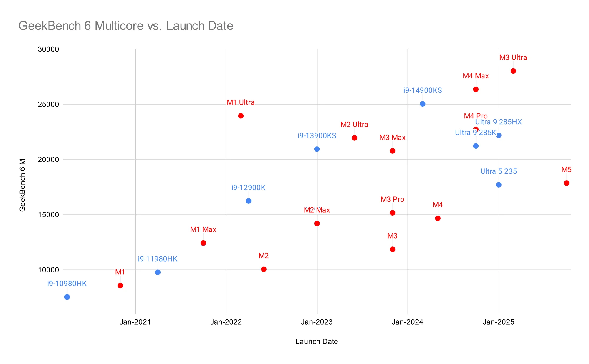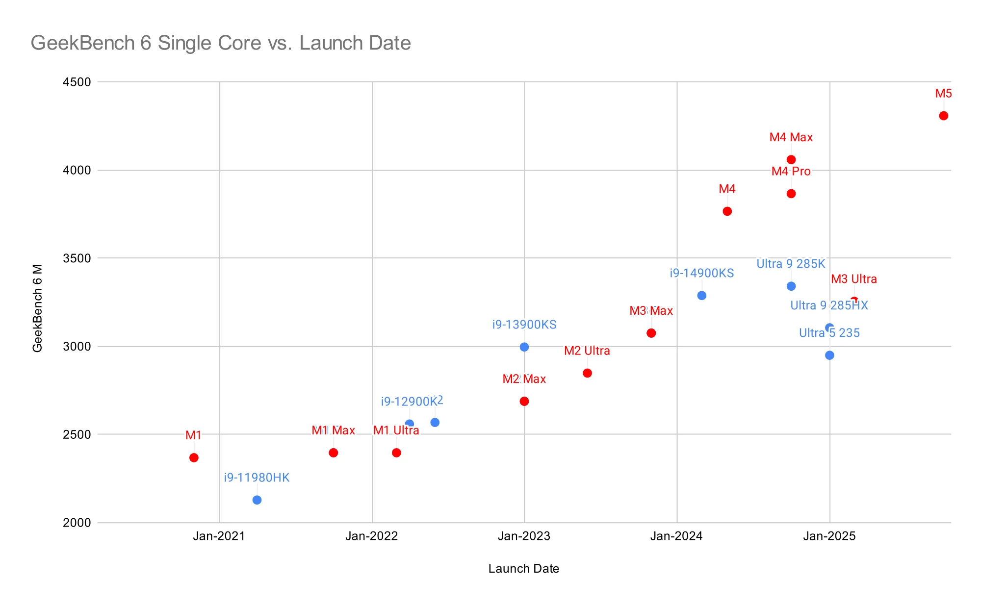 Power Efficiency: Being designed as a mobile chipset, power efficiency is everything in Apple Silicon. Consumer chips like the M1 and M2 peaks at 10W and idle in single digits which enable Apple to create passively cooled laptops. Intel does have low wattage models in their line up but performance does not even hold a candle against Apple watt-for-watt.